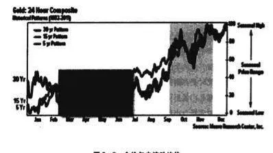 我們可以看到圖5-8裏面顯示的綠色線是30年的均價,橙色線是近15年均價,淡淺藍色是最近5年的均價。可以說每年的黃金價格低谷期是從3月份到6、7月份左右,圖中這三根均線都顯示這個時期是低谷期。只是從最近五年的均價來看,好像走得稍微強一點,伹是3月至7月還是比較弱的幾個月份。15年均價和30年均價要更弱,所以我們可以說這些月是黃金在一年中的淡季。圖中顯示旺季開始於8月,一直會持續到9月。這個統計和我們剛纔看的情緒指標是比較吻合的,尤其是和谷歌趨勢非常吻合一般噩夢開始到秋季以後,市場會追捧黃金,然後是到年底的11月和12月,有一個過節因素,尤其是印度。印度結婚季節很長,大約半年的時間,從年底一直到次年的1、2月份都是結婚季節,所以這段時間裏面市場對黃金保持比較旺盛的需求。通過觀察這幅圖,我們就可以發現如果要做多黃金你要選一年中的哪段時間。