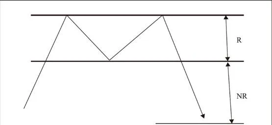 第二,假設M頂頂點到下軌線之間的距離爲R,那麼當股價自下軌線下跌到R的距離時,就會遇到一定的支撐。有的股票震盪之後會跌破支撐位,有的股票則會出現反彈向上走勢。