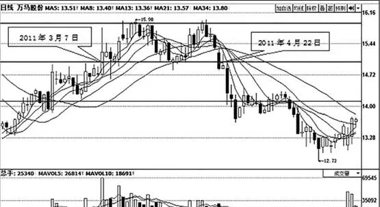股價跌破下軌線位之後,一般要到下軌線與最高點之間距離的整數倍位置纔會企穩。萬馬股份就是在下軌線與最高點之間距離的一倍處出現了反彈。