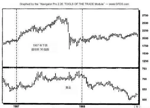 圖4-15 1987年股市大跌和黃金價格走勢(周線圖)