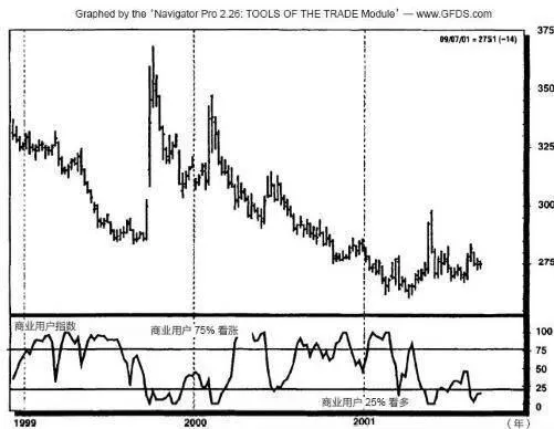 圖4-16顯示商業用戶對黃金市場的重大影響,圖中的一個指標是衡量商業用戶的黃金期貨上淨多頭比率。這個指標可以真實地測量商業用戶實際上如何投資的。通常情況下,商業用戶變得積極做多(這時,他們的淨多頭比率處於很高的位置),金價就大漲。請注意商業用戶在1999年秋季大量賣出,隨後金價崩盤;2001年年初商業用戶開始買進,隨後金價上漲。