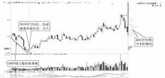 7月6日走勢出現DIFF線與股價底背離+K線看漲吞沒形態,此時籌碼分佈較爲分散。之後,股價緩緩上漲,形成推土機式拉昇形態。到8月17日,許多高位籌碼紛紛出場,而主力則趁機全部接下,形成籌碼的密集峯。