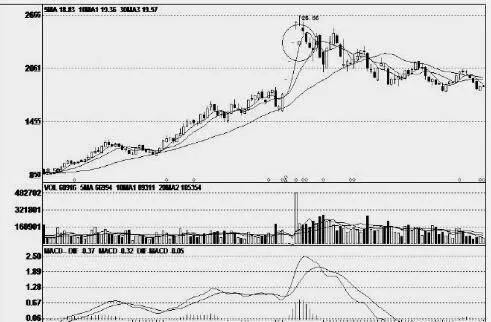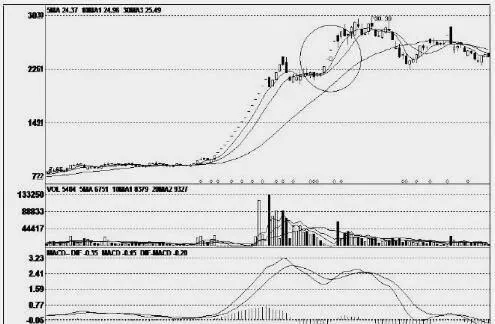 該股的漲停一字陽線出現在股價經過長期上漲之後的加速拉昇階段,這是莊家誘多出貨行爲。經過幾天的快速拉昇之後,股價陷入了長時間的盤跌走勢。從圖中可以看出,在前期上漲過程中,股價呈現出堅挺的上升趨勢,成交量也保持活躍狀態,盤面上似乎很少出現拋盤。隨後在高位收出了漲停一字陽線,且在出現一字陽線的當天,成交量出現極度萎縮的狀態。結合前期走勢情況來看,盤中拋售的籌碼並不多,否則成交量必然出現放大,這很容易讓投資者認爲是莊家高度控盤的結梁,可見莊家的欺騙手法非常高明。