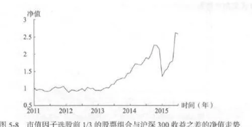 圖5-8則是逐月地將市值因子排序前1/3的股票組合收益率減去滬深300指數的收益率後,所得到的收益率序列形成的淨值走勢。淨值從2010年12月收盤的1開始,在2015年6月底達到2.5842,四年半的收益率爲158.42%,折算下來的年化收益率爲23.49%。四年半之間的最大回撤率爲40.38%,回撤的開始點爲2014年9月收盤的2.2646,結束點則是2014年12月收盤的1.3503,實際上四年半中的主要回撤就是最大回撒下的這三個月。由於最大回撤的特殊性,整個交易過程中平均的年度最大回撤率這一指標在一定程度上失去了評判的意義,因此不再具體給出。