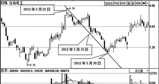 此時,投資者如利用股價X線技術,以M頂的左側高點(2012年2月22日股價高點)爲頂點,與形成第一次反彈時的拐點(2012年3月15日股價低點)相連接,就會得到一條下降股價X線。此後,股價一路向下。
