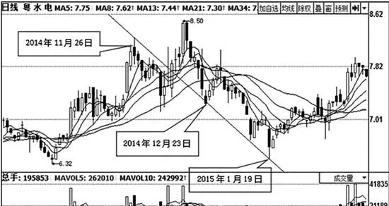 此時,投資者如利用股價X線技術,以頭肩頂的左肩(2014年11月26日股價高點)爲頂點,與形成右肩時的拐點(2014年12月23日股價低點)相連接,就會得到一條下降股價X線。此後,股價在右肩完成後一路向下。