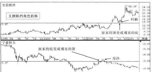互換—支撐位被突破後,回抽至原支撐位時,原支撐位就變成了阻力位;阻力位被突破後,反撲至原阻力位,原阻力位就變成了支撐位。這就是“原來的頂變成現在的底,原來的底變成現在的頂”這句經典名言的技術內涵。這種特性不僅對於理解和掌握支撐和阻擋有着重要的意義,也是突破技術重要的技術支撐(圖1-3-21)。