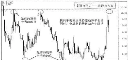 波段的頂部和底部是重要的阻力位與支撐位已成爲一個不爭的市場事實。股價常常在上漲至前期波段頂部附近時受到阻擋而回落,形成一個新的波段頂部;股價常常在下跌至前期波段底部附近時受到支撐而反彈,形成一個新的波段底部。