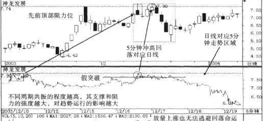 5分鐘線的走勢與日線中重合阻力位所產生的不同週期阻力共振,直接導致該股在12月6日衝高回落走勢的形成。