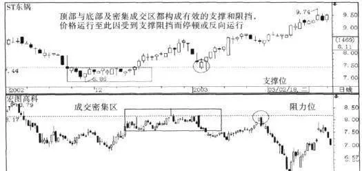 當前股價下方或上方的頂部或底部及密集成交區都構成有效的支撐和阻擋,價格運行至此因受到支撐阻擋而停頓或作反向運行。