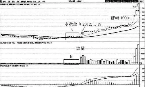 與A區域相對應的B區域,成交量保持持續小量。A、B兩個區域合參,該股呈現了非常經典的“水漫金山”形態。