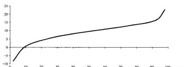 那麼,假如不能使用DCF,我們該如何進行估值呢?我最贊成的一種方法就是採用反向工程DCF。這種方法不需要預測未來10年的增長率,而是以當前股價爲基礎,由此推導其內含增長率。之後,分析師對這個內含增長率進行評估,或是與根據圖5-6和圖5-7等已實現增長率的分佈作對比。這樣,我們就可以對內含增長率如何實現或是其他情況作出評價。