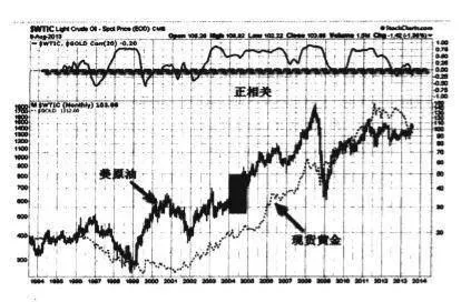 我們再講一下原油,國際原油好幾個品種,歐洲的北海布倫特,還有迪拜原油,以及美國的原油。美國的原油全稱是西徳克薩斯輕質原油,代碼是WTIC。我們先看一下WTIC和黃金的關係(圖4-16)。