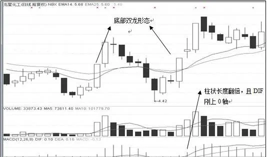 圖中顯示該股被選出的當天收放量陽十字,且雙線之DIF剛上0軸,DEA有跟上的趨勢,MACD助攻形態良好。漲停當天柱狀值爲0.02,十字星當天爲0.08,明顯已經翻倍,且超過不少,說明運行速度十分迅速。另外該股之前的形態屬於比較漂亮的底部雙龍形態,成交量配合良好,此次再次上攻創新高可能性非常大。