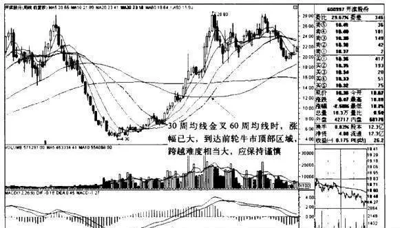 - 30周均線金叉60周均線後,若20周、30周、60周均線呈多排,則可一直持股。上漲途中不需要在意5周均線死叉10周均線等情況,直到5周、10周等短期周均線與20周、30周等長期周均線距離很遠,高位出現覆蓋線、黃昏十字星等見頂跡象、或者股價跌破20周均線,10周均線死叉20周均線。